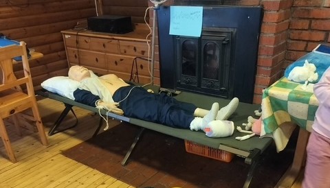 Tämän vuoden leirin teemana oli ensiapu, ja ohjelma rakentui erilaisten auttamiseen liittyvien tehtävien ympärille. Leirisairaalaankin saatiin potilas, kun Norbert Tiina vietti leirin mukavasti lavetilla pötkötellen ja toimi esimerkillisenä harjoituspotilaana.